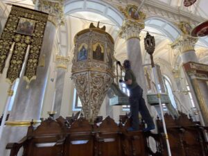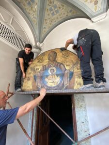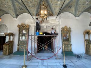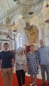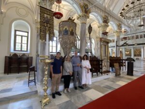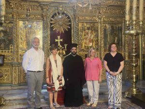 Το διάστημα 24-28 Ιουλίου 2025 η Πρόεδρος του ΔΣ του ΕΚΒΜΜ, ομότιμη καθηγήτρια Ναταλία Πούλου, ο καθηγητής Γεώργιος Πανέτσος και η Βάσω Παπαγεωργίου, Προϊσταμένη στη Διεύθυνση Τεκμηρίωσης και Προστασίας Πολιτιστικών Αγαθών, ως μέλη του ΔΣ καθώς και η διευθύντρια του ΕΚΒΜΜ Φλώρα Καραγιάννη, πραγματοποίησαν επίσκεψη στο Οικουμενικό Πατριαρχείο στο Φανάρι της Κωνσταντινουπόλεως. Εκεί τους υποδέχτηκε εκ μέρους της Α.Θ.Π. Οικουμενικού Πατριάρχη κ.κ.Βαρθολομαίου, ο Πρωτοσύγκελλος π.Γρηγόριος Φραγκάκης, ο οποίος μετέφερε εκ μέρους του Παναγιωτάτου, τις ευχαριστίες και την ευγνωμοσύνη του Πατριάρχου για όλα τα έργα που υλοποιεί τα τελευταία χρόνια το Ευρωπαϊκό Κέντρο Βυζαντινών και Μεταβυζαντινών Μνημείων στην έδρα του Πατριαρχείου, σε ναούς της Αρχιεπισκοπής Κωνσταντινουπόλεως και στη Μητρόπολη Ίμβρου και Τενέδου. Η αντιπροσωπεία του ΕΚΒΜΜ είχε την ευκαιρία να δει από κοντά, το τέμπλο, τα προσκυνητάρια και τον νάρθηκα του πατριαρχικού ναού, όπου οι συνεργάτες του Κέντρου μας υλοποίησαν εργασίες συντήρησης, τόσο στα έργα ξυλογλυπτικής, όσο και σε έργα μαρμαρογλυπτικής και σε φορητά ζωγραφικά έργα. Τόσο η Πρόεδρος όσο και τα μέλη εξέφρασαν την απόλυτη ικανοποίηση και χαρά τους για το εντυπωσιακό έργο που έχει επιτελεστεί και για τα λαμπρά αποτελέσματα που είναι ορατά σε κάθε επισκέπτη του πατριαρχικού ναού.