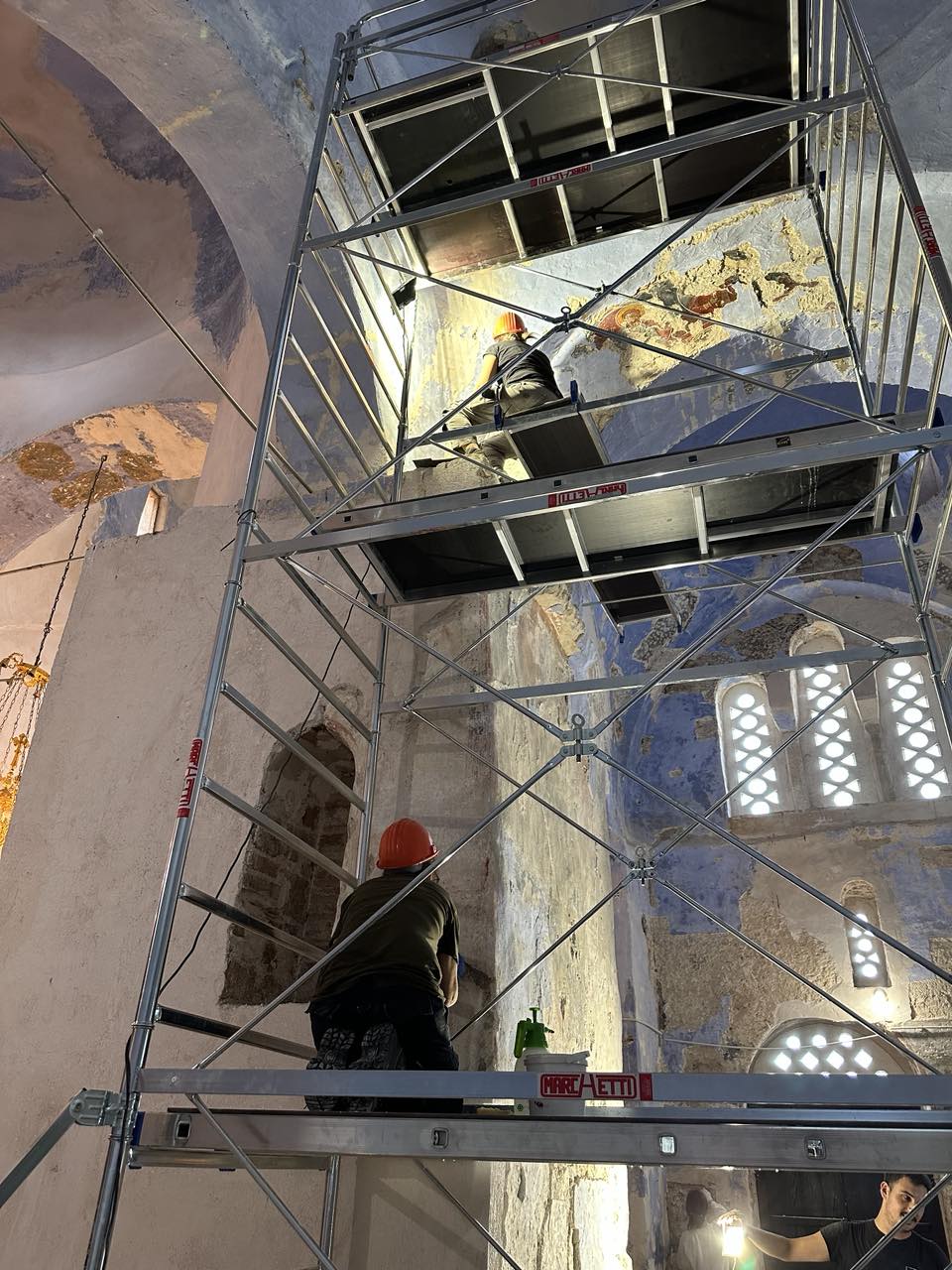 In June 2023, the conservation study for the wall paintings and decorative elements of the church was submitted to the Albanian authorities for approval. The study was prepared, on behalf of EΚBMM, by the Directorate for the Conservation of Ancient and Modern Monuments of the Hellenic Ministry of Culture, based on the documentation data collected by EΚBMM’s specialized scientists during the previous year. Following the relevant approval, preparations for the first phase of wall-painting conservation began in May 2024.